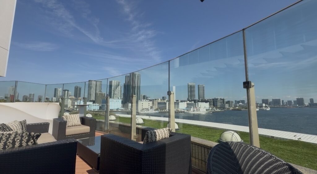 エレベーターを降りた瞬間、目の前に広がるのは一面のガラス越しに輝くベイエリアのパノラマ。