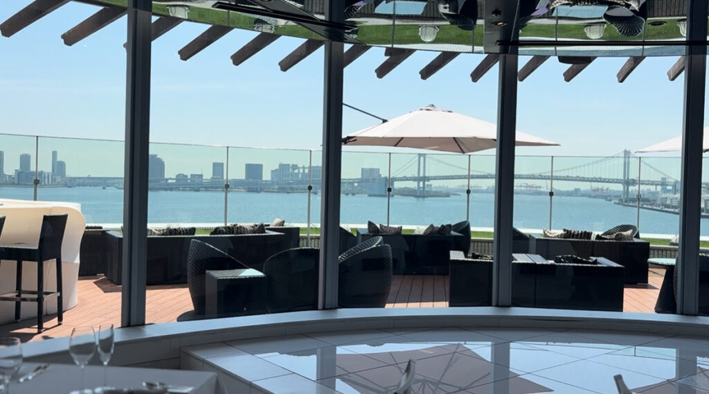 ガラス越しに、視界一面広がる青い空と海。東京湾の景色を望みながら、リゾートに来たかのような優雅な昼の時間を堪能できます。