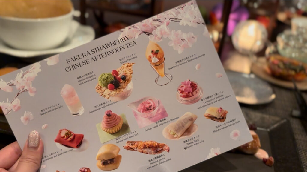 今回の「桜いちごチャイニーズアフタヌーンティー」は、セイボリーもスイーツも盛りだくさん🥰メニューもおしゃれです!